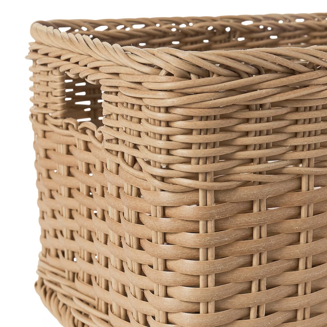Handwoven plastic rattan looks like natural rattan, but is more durable for outdoor use.