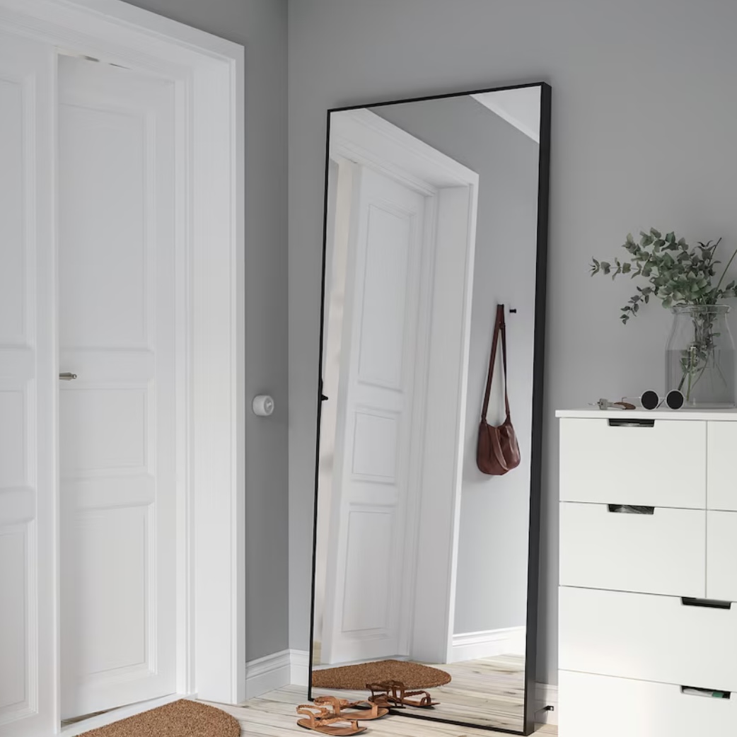 HOVET mirror can hang either on a wall or be placed on the floor anchored and tilted against a wall.