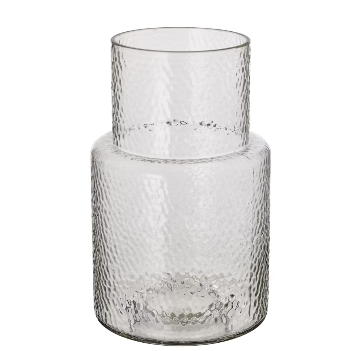 This tall semi-transparent glass vase with texture has a shimmering surface and goes nice with something like long and elegant roses or other bouquets.