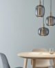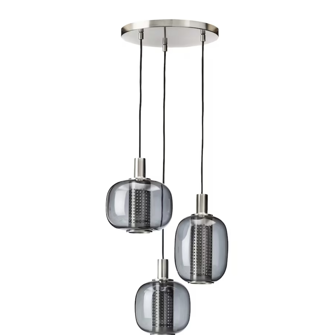 Inside the pendant lamp’s 3 smoke-coloured glass shades is a shade made of perforated metal, which provides both pleasant mood lighting and directed light over the surface below.